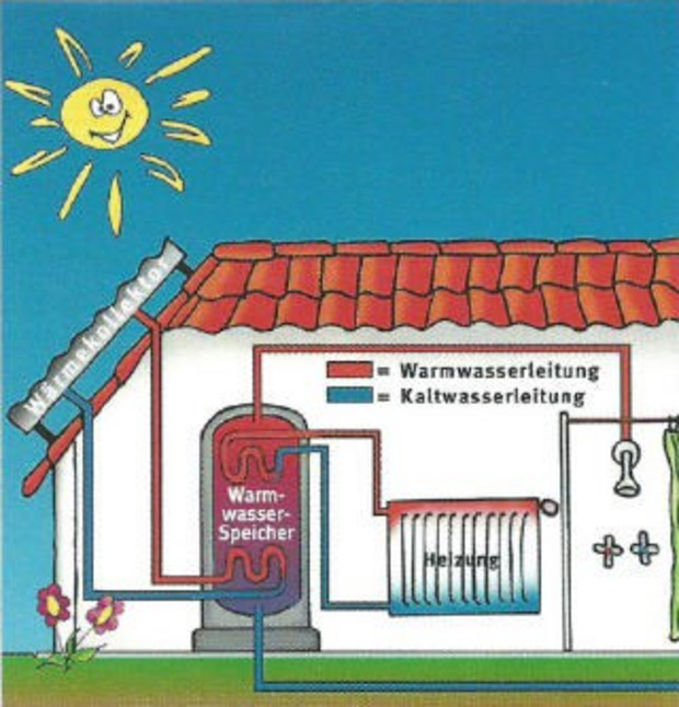 Auf einigen Dächern sind thermische Solaranlagen installiert, die mit Sonnenenergie warmes Wasser bereiten.