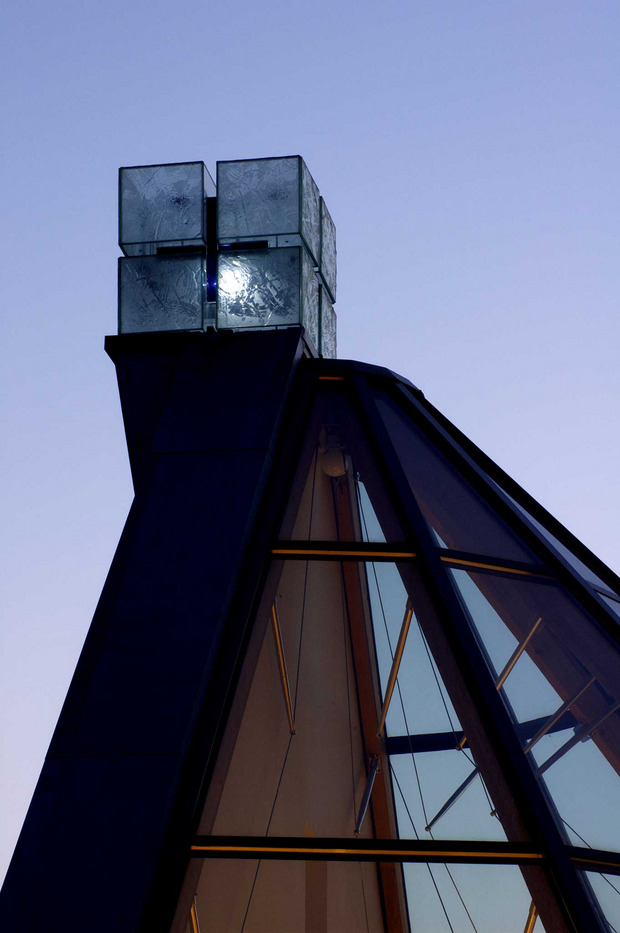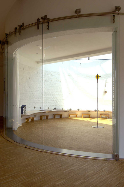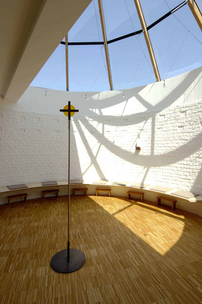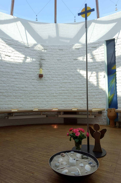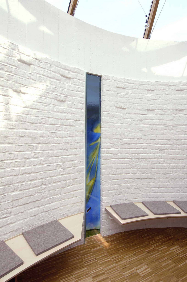 Diese Funktion als Gedenkort spiegeln die Kapellenfenster wider. Das kleine Giebelfenster wirkt wie eine Sonnenuhr und lässt einen Lichtstreifen auf der runden Mauer wandern.