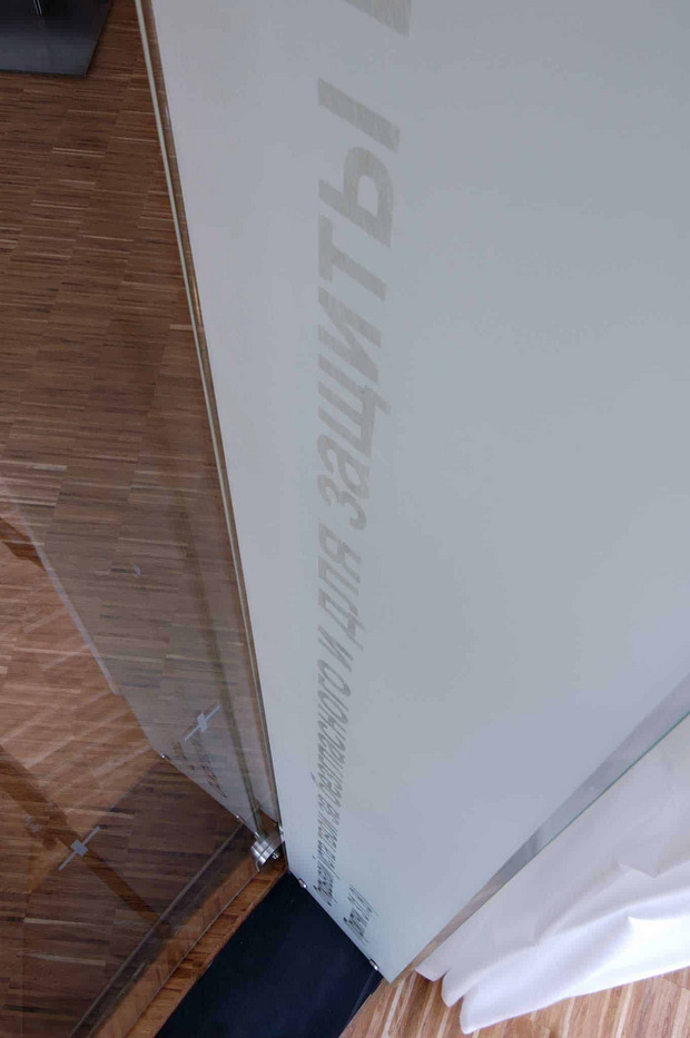 Rechts und links in den Laibungen des Eingangs sind zwei Glasplatten angebracht, die (in Deutsch und Russisch) den Bibeltext tragen: