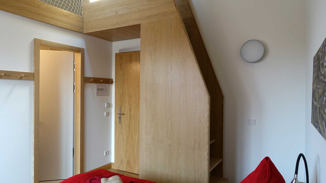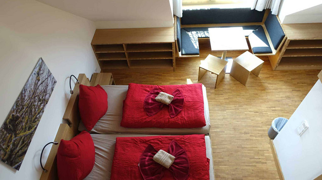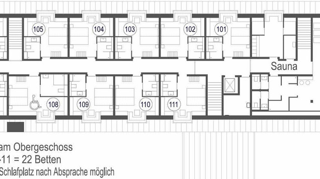Im Obergeschoss befinden sich 11 Doppelzimmer, die jeweils über eine Hochebene verfügen, die als Schlafplatz für eine größeres Kind geeignet ist. Die Hochebenen werden nur auf besondere Anfrage bereit gestellt.