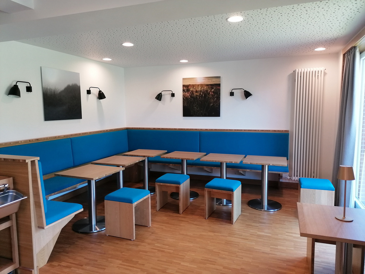 - Sitzgelegenheiten für Austausch, Pausen oder informelle Gespräche im Innen- und Außenbereich